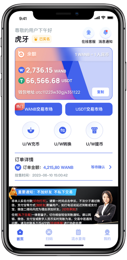 所有买卖交易均在我司APP上进行实时交易,所有私下交易添加好友转账都是骗子,请勿添加!诈骗手段如下:借支付宝.微信收款二维码风控为由,要求添加好友进行银行转账,骗子通过你的手机号,模仿银行短信到账,诱导用户!请广大用户务必小心谨慎,交易中一定要登陆自己的网银确认到账后 再进行打币!发现异常请及时联系我们24小时在线客服!